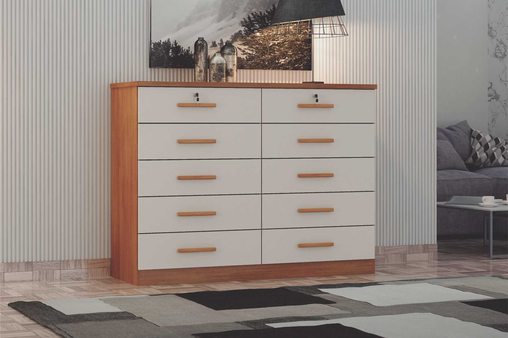 Cômoda com 10 gavetas espaçosas, sendo duas com chave para guardar itens com mais segurança. As gavetas são equipadas com corrediças telescópicas, que garantem abertura suave e maior durabilidade. Ideal para quem busca organização e praticidade no dia a dia.
