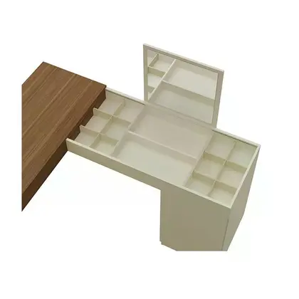 Penteadeira: vidro deslizante, painel fixo com espelho, nicho organizador interno.